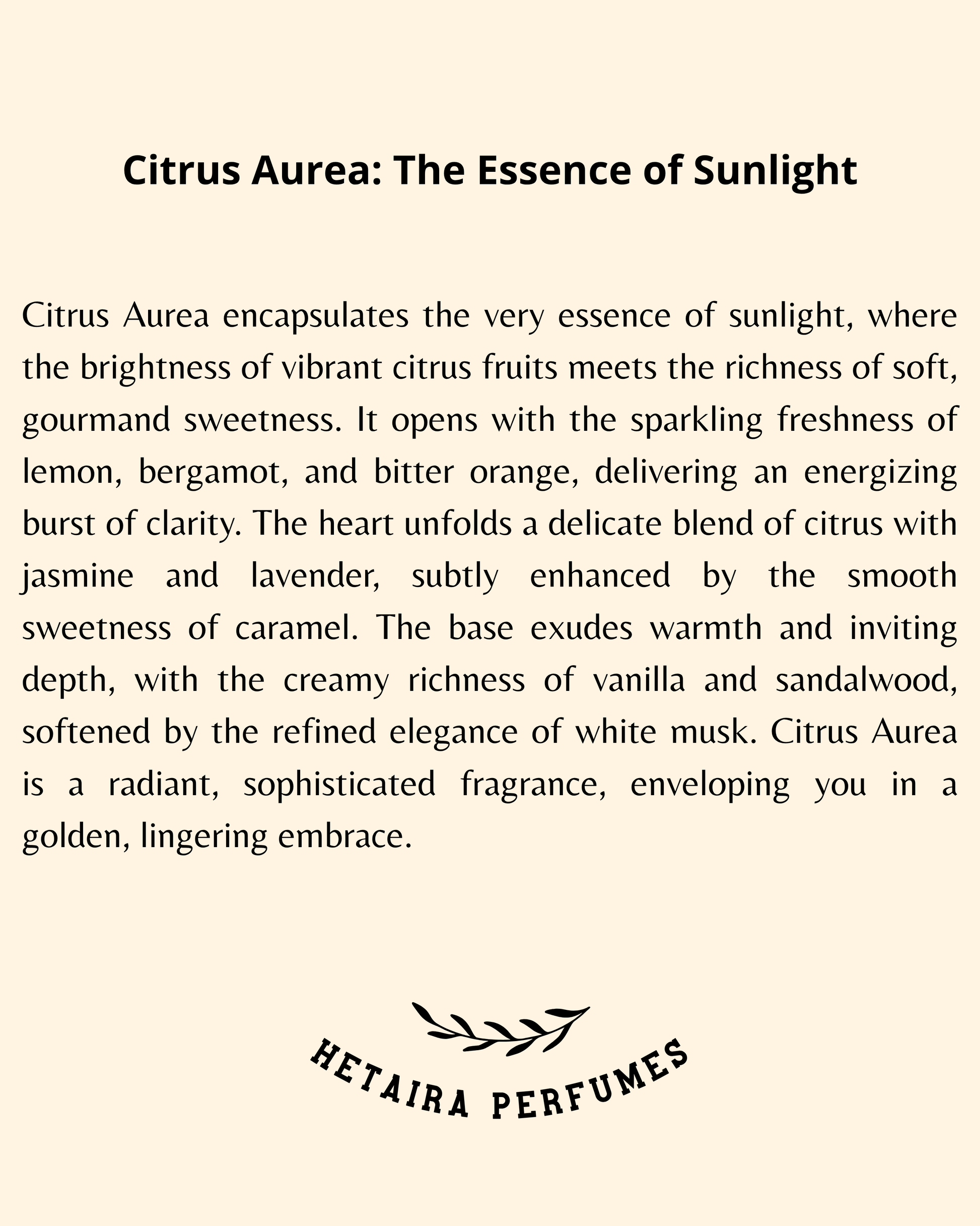 Citrus Aurea encapsula la esencia misma de la luz solar, donde la luminosidad de los cítricos vibrantes se encuentra con la riqueza de una suave dulzura gourmand. Se abre con la frescura chispeante del limón, la bergamota y la naranja amarga, ofreciendo una explosión de claridad y energía. El corazón revela una delicada mezcla de cítricos con jazmín y lavanda, sutilmente realzada por la suavidad del caramelo. La base exhala calidez y profundidad acogedora, con la cremosidad rica de la vainilla y el sándalo, suavizada por la refinada elegancia del almizcle blanco. Citrus Aurea es una fragancia radiante y sofisticada, que te envuelve en un abrazo dorado y persistente.