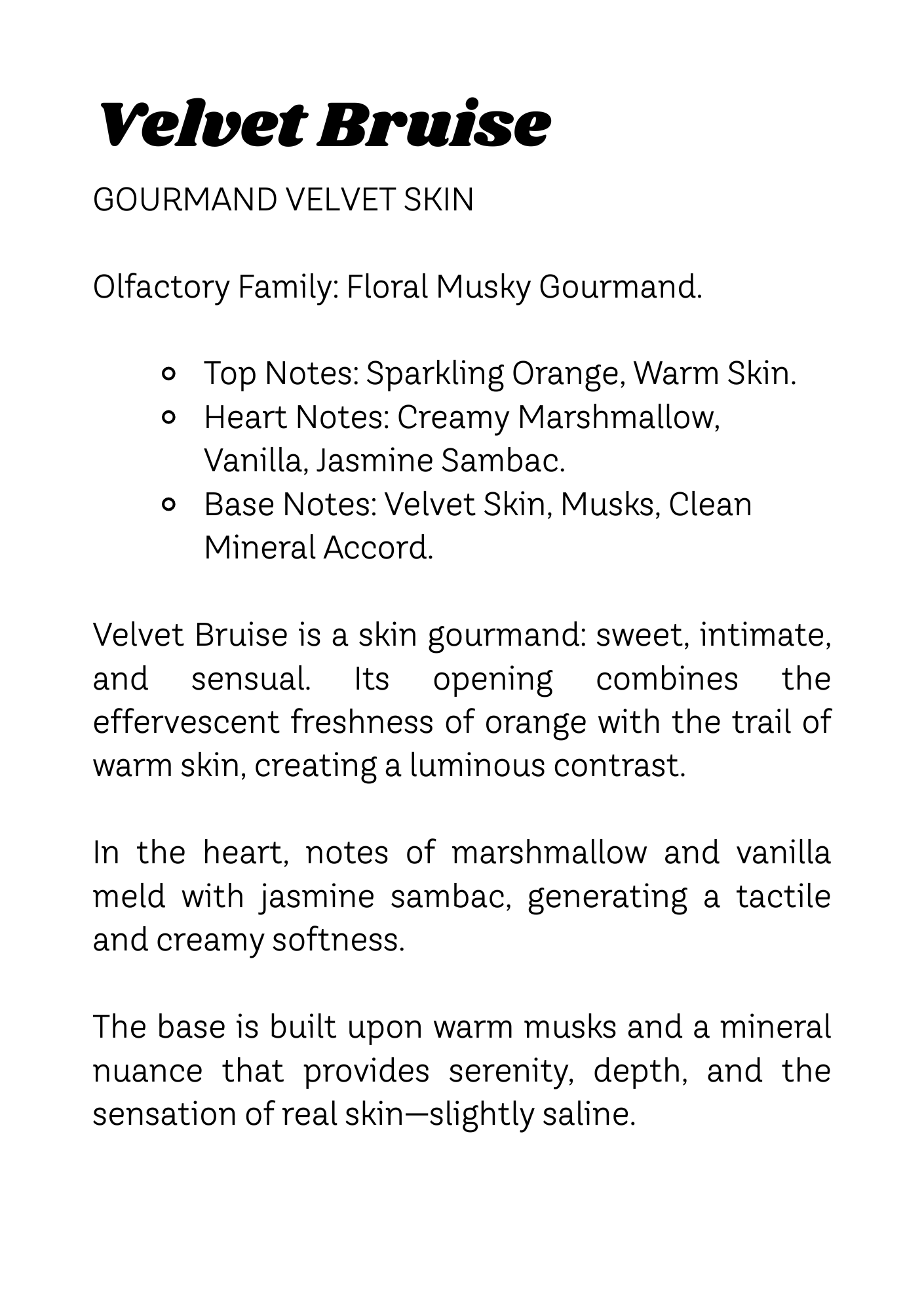 Velvet Bruise es un gourmand de piel: dulce, íntimo y sensual. Su salida combina la frescura efervescente de la naranja con el rastro de piel caliente, creando un contraste luminoso.